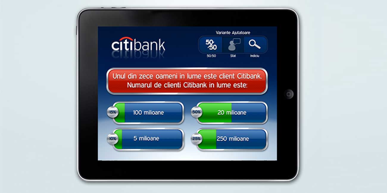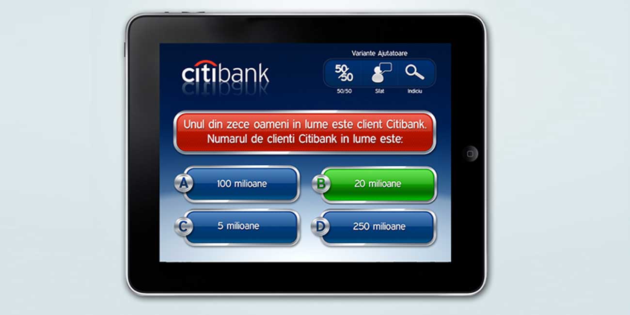 We were invited to participate and won a pitch to create a web app for iPad, a quiz with random banking questions that the Mall visitors had to answer to win a prize. The winners would be invited to collect the prize from the branch. The app also collected contact data of the respondents, to further allow retargeting.